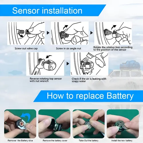 SENSORES INTELIGENTES: 4 sensores externos, fácil de instalar, se puede recibir a larga distancia, y la señal es estable y duradera. Este sensor funciona con 4 baterías. El sensor externo se puede instalar en pocos minutos, equipado con tornillos antirrobo para prevenir el robo. Soporta cambios de posición de neumáticos libres.
